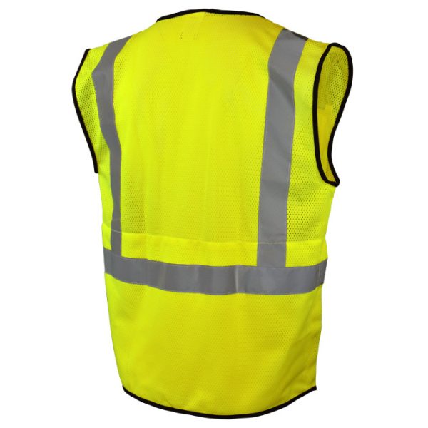 Radians SV75B Surveyor Type R Class 2 Self-Extinguishing Safety Vest features a black bottom, two Mic Tabs and a zipper closure. The SV75B has five pockets, including a radio pocket, upper split pocket with pencil pockets, lower front covered pockets and a rear plan pocket. This garment is made from polyester treated to be self-extinguishing as defined by ASTM D6413 (< 2.0s flameout / < 6″ char length). This garment should never be used where an arc flash or flash fire hazard is present.