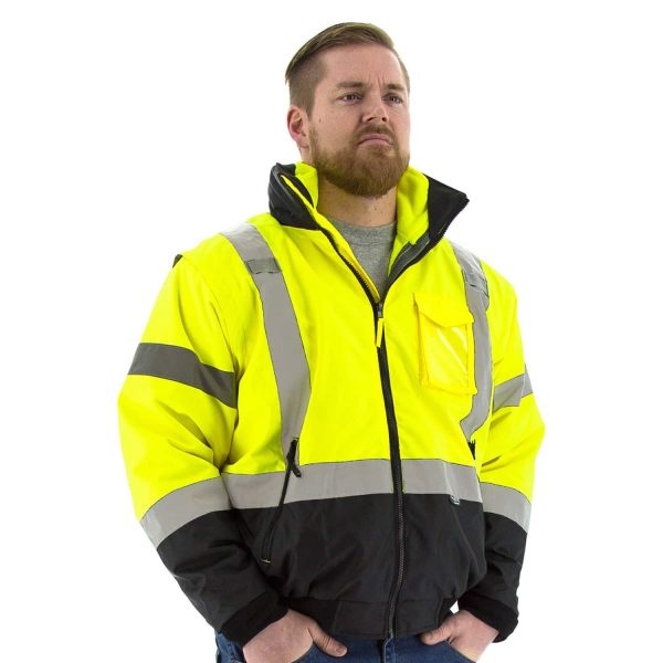 - High visibility yellow/black 8-in-1 Transformer bomber jacker with removable liner