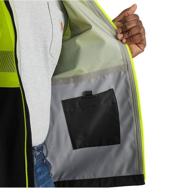 Stay dry. Be seen. Get the job done through wet weather in this men’s Class 3 high-visibility rain jacket. Waterproof, breathable fabric and fully-taped seams seal out rain and keep you comfortable while you work and move. Pockets inside and out keep workday essentials dry and easy to reach. Reflective tape boost visibility.