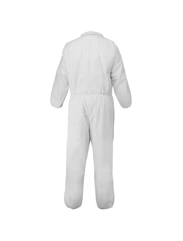 These non-woven coveralls are for those who need a durable disposable coverall that protects against light liquid splashes, debris, and dry particulates. They are low-lint, anti-static, and breathable with premium white 55-gram microporous PE film-laminated material. The ankles, waist, and wrists include elastic for a secure fit. These coveralls feature a bat wing design, a reinforced triangle crotch, serged seams, and a collar. The zipper closure has a storm flap for added protection against particles.