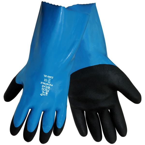 These premium, super flexible gloves are 12 inches in length and are made of a nitrile/PVC blend with sandpaper finish on a seamless inner liner. Nitrile provides chemical resistance and blended with PVC, adds additional flexibility. These gloves stays flexible in low temperatures and the sandpaper grip enhances handling of slippery objects wet or dry.