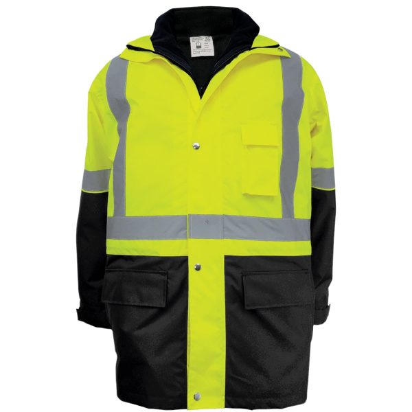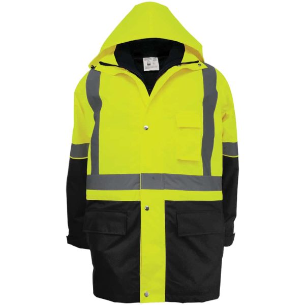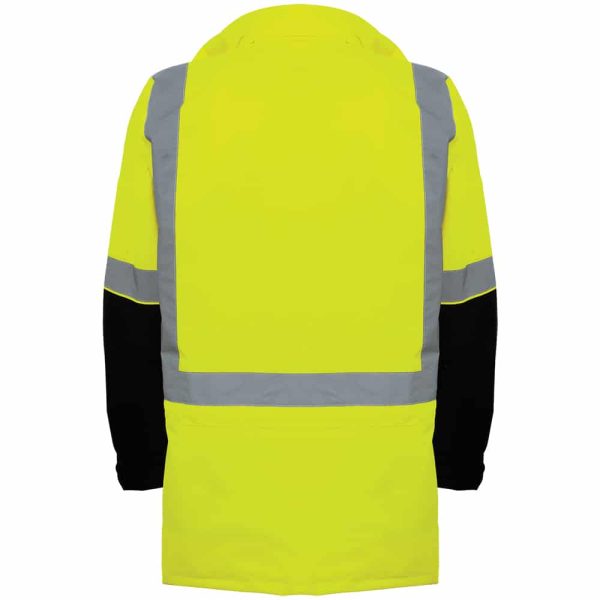 ANSI Class 3 high-visibility three-in-one winter parka jacket featuring PU coated 300D oxford polyester exterior with fully taped seams. This jacket also has 3M™ reflective material, a zipper plus snap closure, a removable and reversible vest, and a black bottom front and knit cuffs. The removable and reversible vest has a black inside and a high-visibility yellow/green outside.