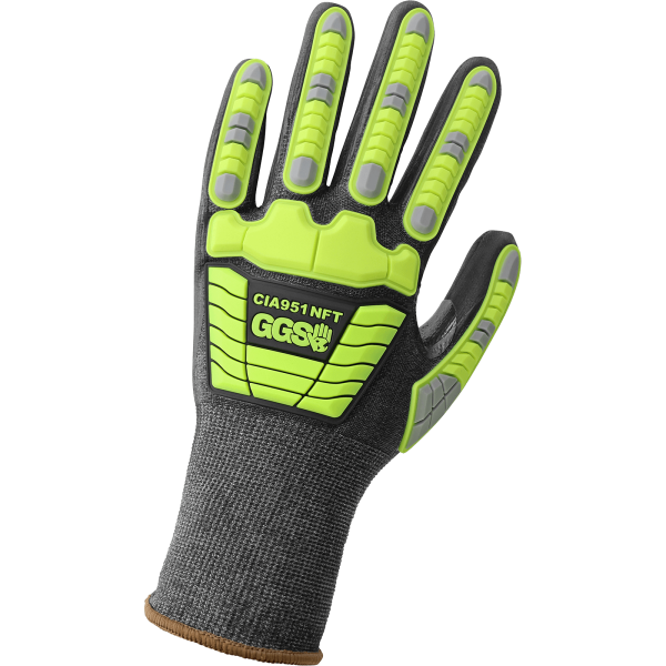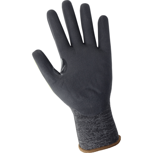 This ultra-lightweight cut-resistant glove is FDA compliant and has a salt-and-pepper seamless 21-gauge Tuffalene® UHMWPE shell. The palm is black with a New Foam Technology finish on the nitrile coating and includes a reinforced thumb crotch. The back of the hand has gray and high-visibility yellow TPU impact protection over the fingers and metacarpal bones. This glove features touch screen compatible fingertips and a knit wrist.