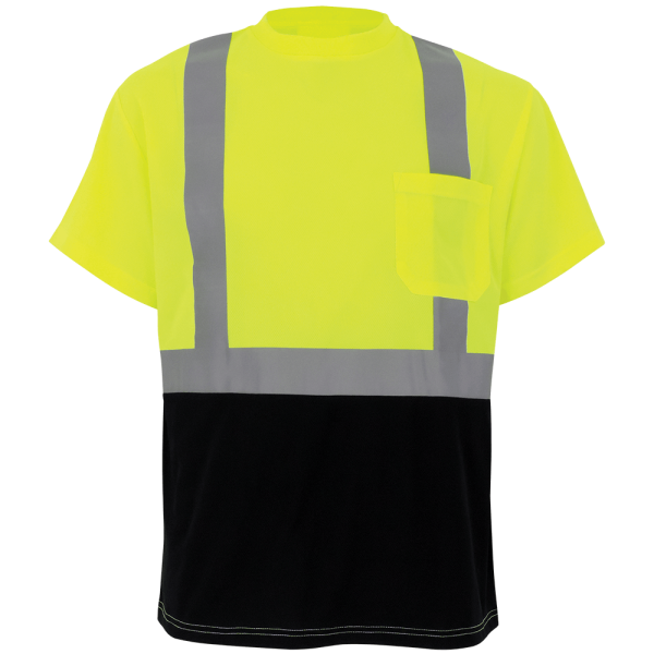 This high-visibility yellow/green self-wicking birdseye mesh polyester short-sleeved shirt is a good option for many jobs. The silver reflective material enhances low-light visibility, and the black bottom front helps the shirt look clean. This shirt features one left breast pocket. The tagless design provides comfort for the user.
