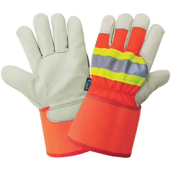 These gunn cut standard-grade grain cowhide gloves are lined with 140 grams of Cold Keep® insulation and feature 3M™ Scotchlite™ reflective tape on high-visibility orange nylon backing with a safety cuff.