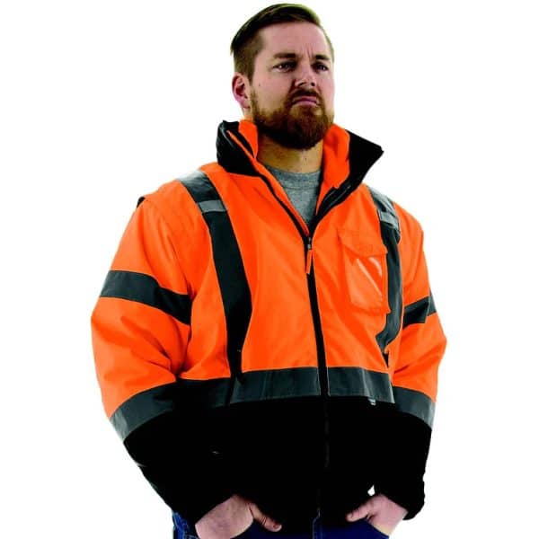 - High visibility orange/black 8‑in‑1 transformer bomber jacket with removable liner