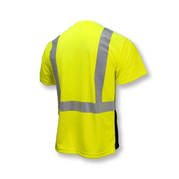 Radians ST11B Type R Class 2 High Visibility T-Shirt with Max-Dri™ Moisture Wicking Mesh. The ST11B safety T-Shirt is made with an arid Birdseye Mesh allowing for maximum breathability, without compromising durability. The stripes are adhered by heat transfer rather than sewn on, making the safety T-shirt wear much more like a regular T-shirt. The wicking properties improve hot weather comfort making it feel much cooler. The front pocket does not include reflective material to allow for corporate imprints. Color blocking at the bottom of the t-shirt.