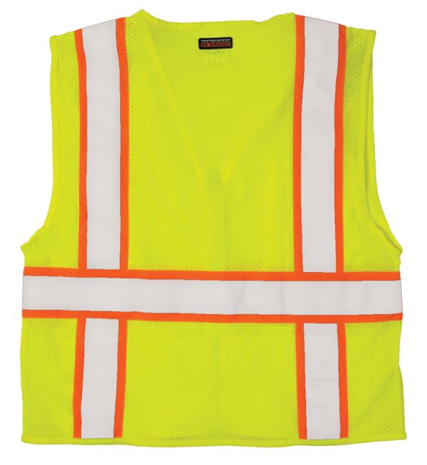 - Surveyor’s vest with contrasting orange striping over lime vest