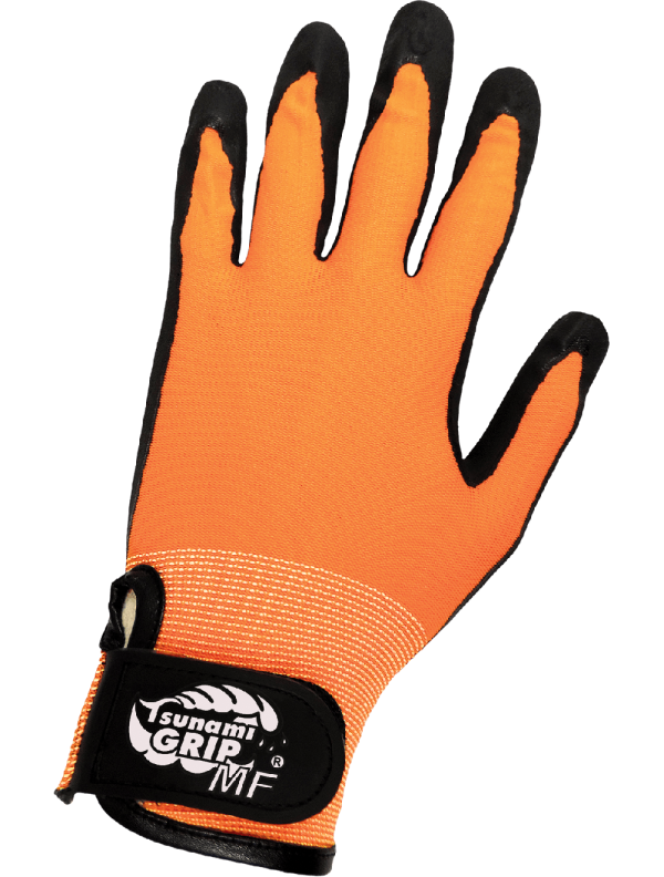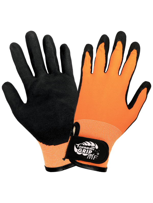 These general-purpose gloves feature a Mach Finish nitrile coating on a high-visibility orange nylon shell with hook-and-loop closure.