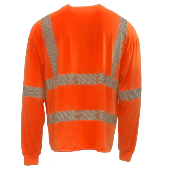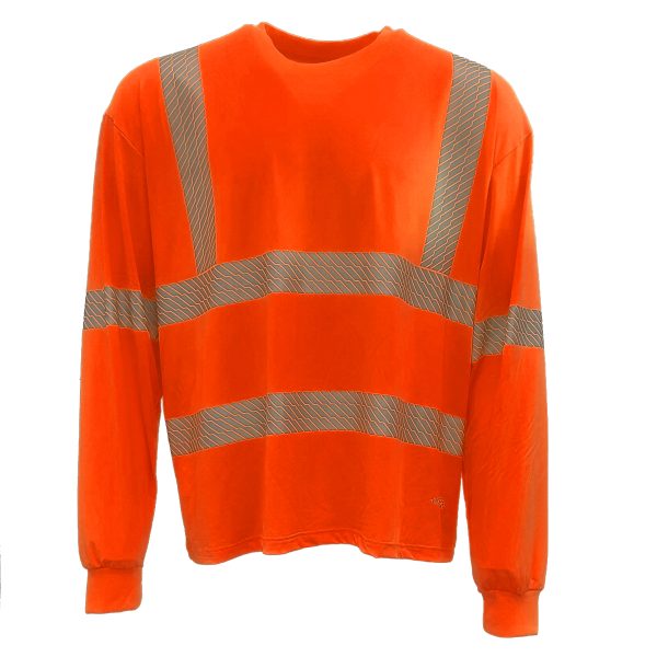 This premium athletic-type long-sleeved shirt is high-visibility safety orange self-wicking high-performance stretch polyester/spandex microfiber. The segmented silver reflective material enhances low-light visibility. This shirt features UPF 15+ sun protection and a comfortable tagless design.