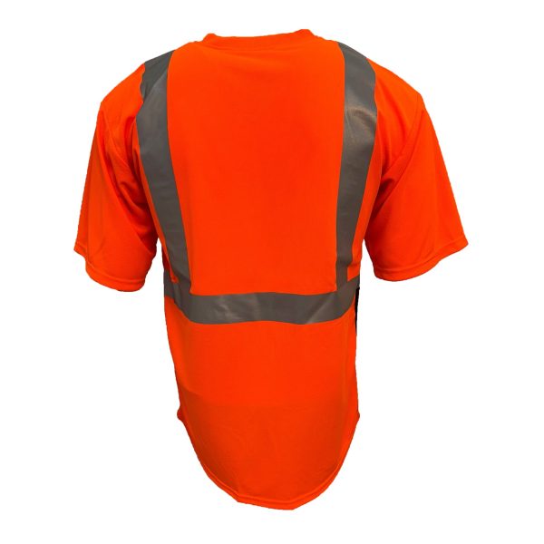Wickmaster™ PRO Class 2 High Visibility Orange T-Shirt with Max-Dri™ Moisture Wicking Mesh. The 2012B short sleeve hi-vis shirt is made with an arid birdseye mesh allowing for maximum breathability, without compromising durability. The stripes are adhered by heat transfer rather than sewn on, making the safety t-shirt wear much more like a regular t-shirt. The wicking properties improve hot weather comfort making it feel much cooler. The front pocket does not include reflective material to allow for corporate imprints. Color blocking at the bottom of the t-shirt.